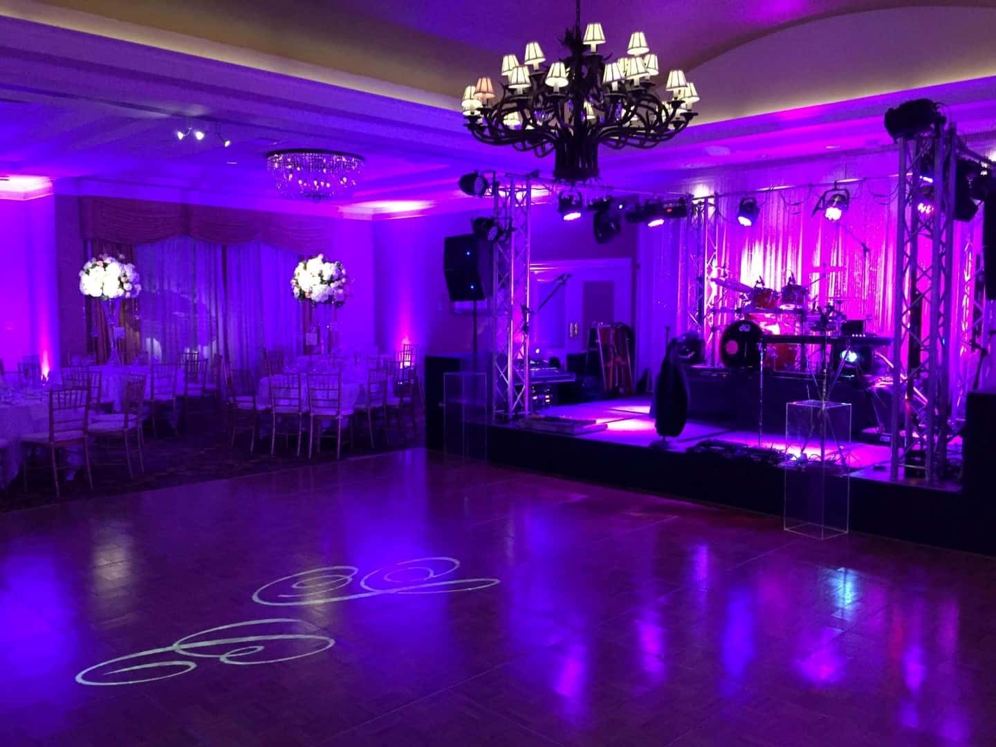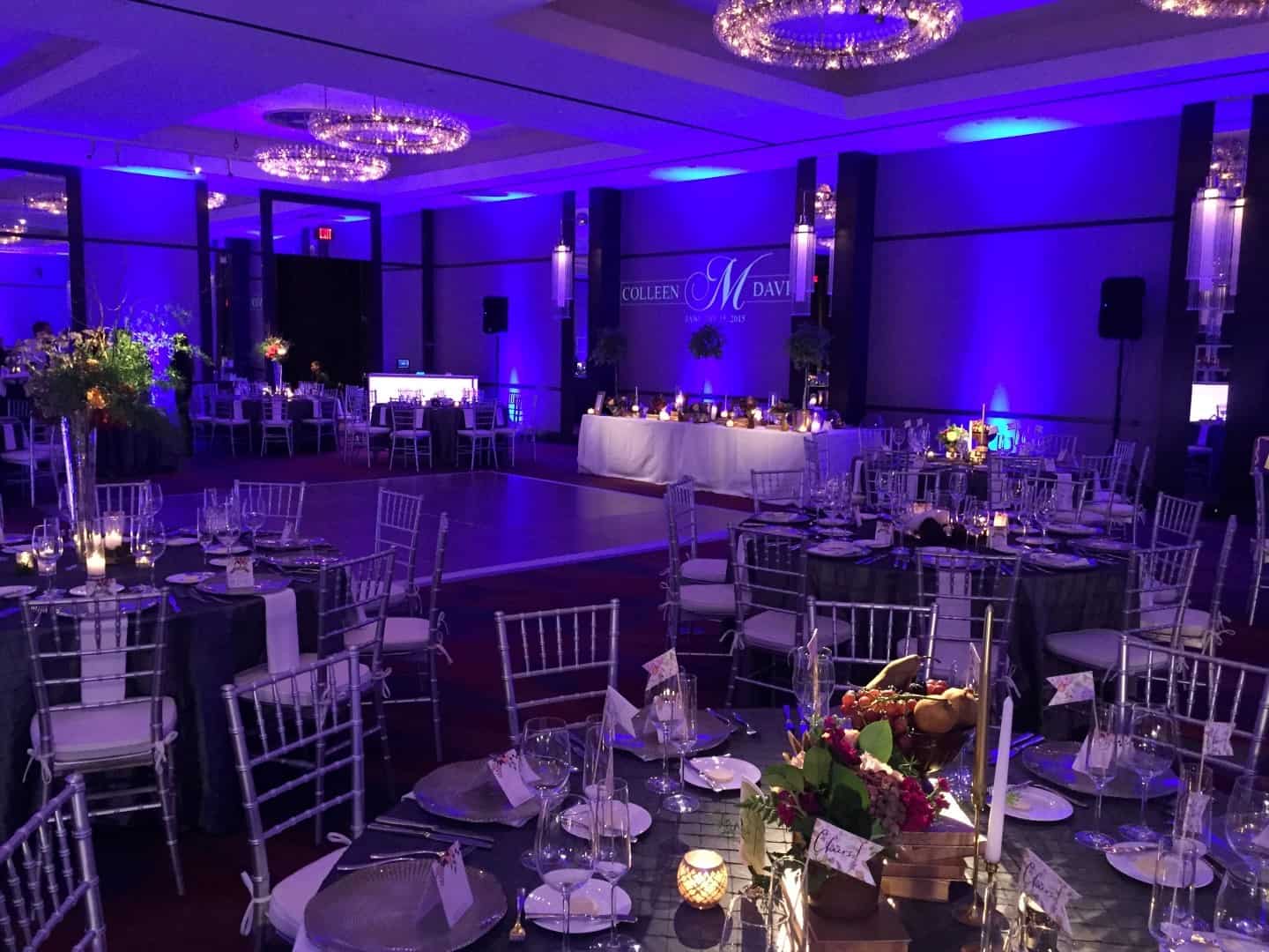 We have the latest state of the art tech in uplighting. Plus, we have more year’s experience than most – which means we have more experience at artistic placement. If we are DJing, we waive the staffer charge and it is just a simple per fixture charge, with no minimum. There are two kinds of uplighting, and we have both: Static and Dynamic.